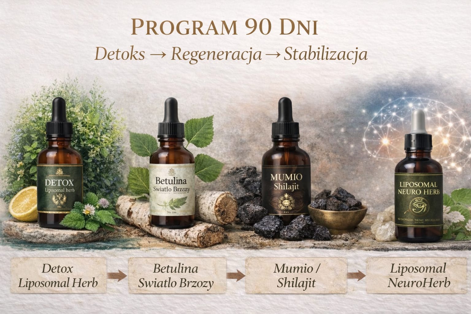 Betulina + Mumio wspierają odbudowę i stabilizację po etapie oczyszczania.